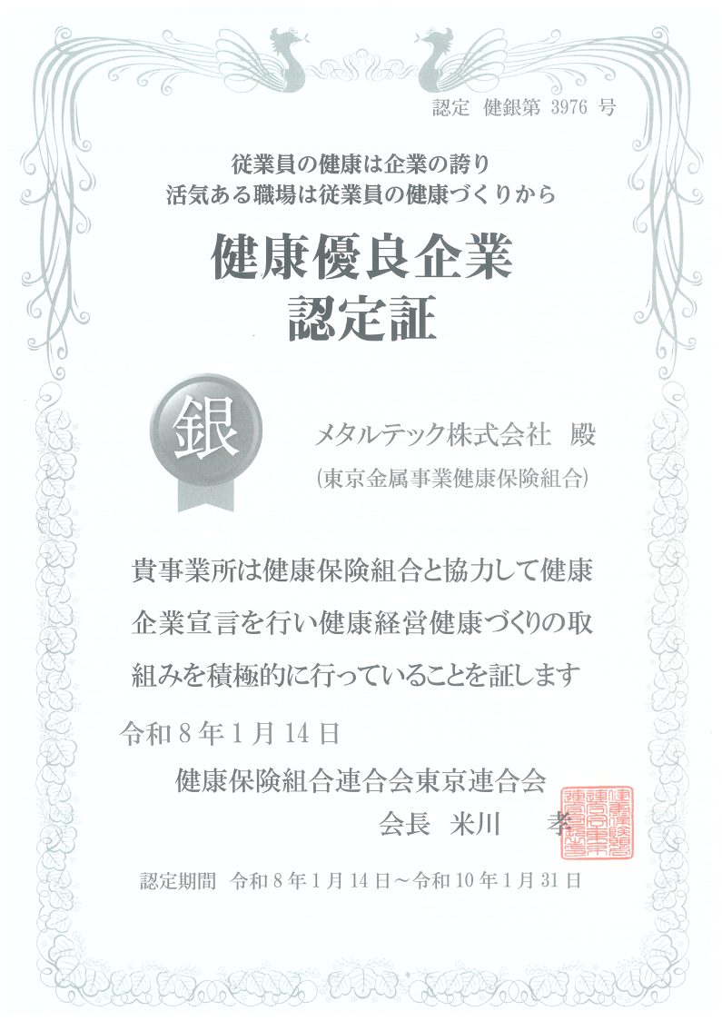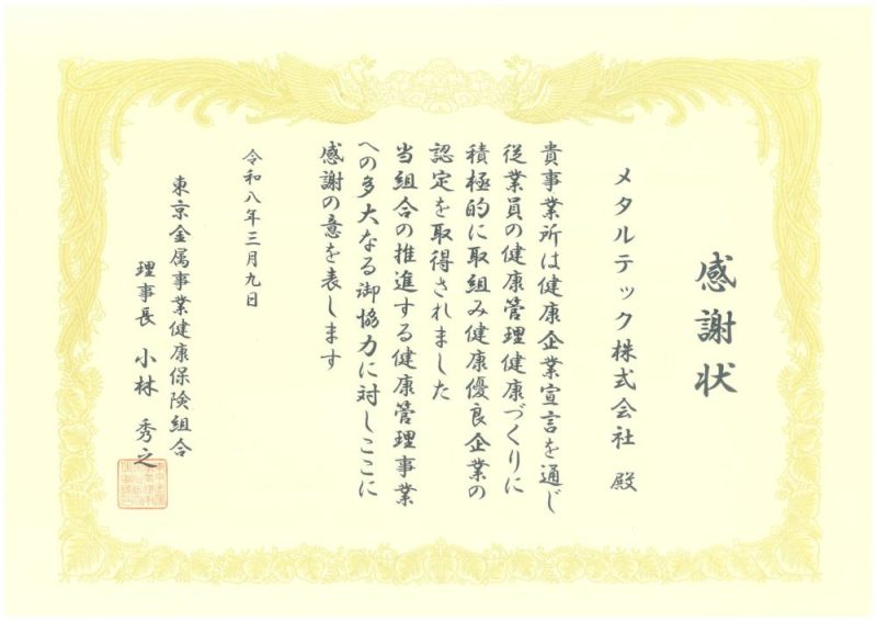 さらに、これらの取り組みに対し、東京金属事業健康保険組合より感謝状をいただきました。 今後も、従業員の健康を基盤とした、生産性の高い持続可能な職場環境づくりに取り組んでまいります。
